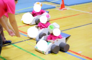 0歳児ひよこ組は、マリオカートの世界に入り、キノピオになって保護者の方とゴールを目指しました!