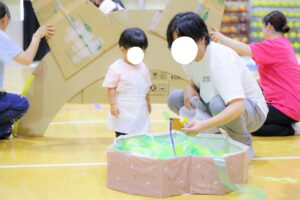 1歳児りす組は、ジャムおじさんになりきり、ボールプールに隠されたアンパンマン達を救い出し、ゴールを目指します!