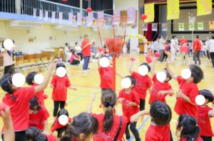 3歳児ぱんだ組・4歳児きりん組・5歳児ぞう組の合同クラスは、最初に親子競技「玉入れ」をしました!子ども達vs保護者で行い、どちらもとても白熱していました!