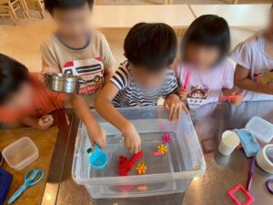 「積み木」「スポンジ」「コップ」が浮いていく中、ひとりの子が「コップは水に入れる時にこっちを下にすれば沈むと思う」と角度の指定が入りました。工夫しながら沈めていく様子に周りの子も上から下からじっと見ていました。