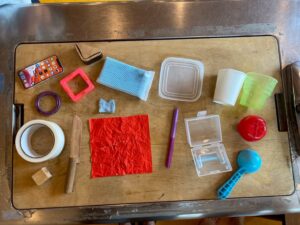 「浮かぶ物」を探してみよう!としばらく部屋の中を歩いて持ってきたのが「折り紙」「えんぴつ」「レゴのパーツ」などなど。