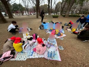 広場で友だちとレジャーシートを広げて、おうちの人が作ってくれたおにぎりを食べました!