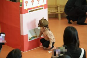 1歳児クラスは4月から子どもたちに馴染めのある絵本と歌を題材にした演目を行いました。『あなたのおなまえは』の手遊びに合わせて自分の名前を応えたり、名前を呼ばれて返事をしたり、緊張しながらもそれぞれの成長が見られました。