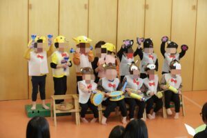 0歳児クラスにとって初めての生活発表会は、鼓笛隊に変身しました!