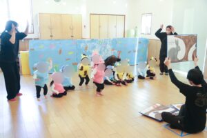 「おもちゃのチャチャチャ」では、手作り楽器のマラカスを使い、「チャチャチャ♪」の音に合わせてマラカスを叩いたり、歌に合わせて動物の鳴き真似をしていました!また、子どもたちが大好きな「ピカピカブー」では、元気いっぱいに身体を動かして踊る姿がありました。