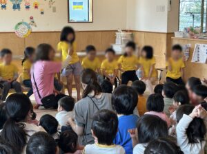 年長さんのお友だちに前へ出てきてもらい、一人ひとりどこの小学校へ行くのか、頑張りたいことなどを話してもらいましたよ!